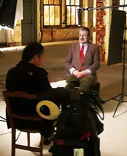 The HBO film's producer George Roy conducting one of its two dozen interviews with hockey historian Bruce "Scoop" Cooper.