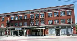 The historic district contains 43 commercial buildings constructed between 1888 and 1930, Our Lady of Lourdes Church, and Our Lady of Lourdes School.[121] Architectural styles represented include Early Commercial, Italianate, Neoclassical, Queen Anne, Renaissance Revival,[121] and Jacobean Revival.[87] Buildings range in height from one to six stories, and all of them front directly onto the sidewalk with no setback.[121] Among the buildings included in the historic district are:[87]