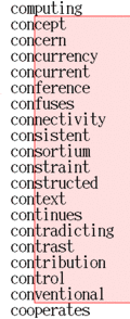 Brzozowski derivative (on red background) of a dictionary string set with respect to the string "con"