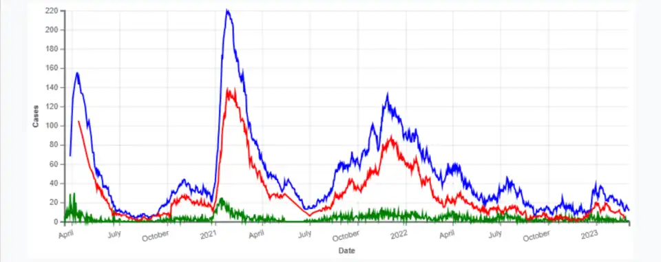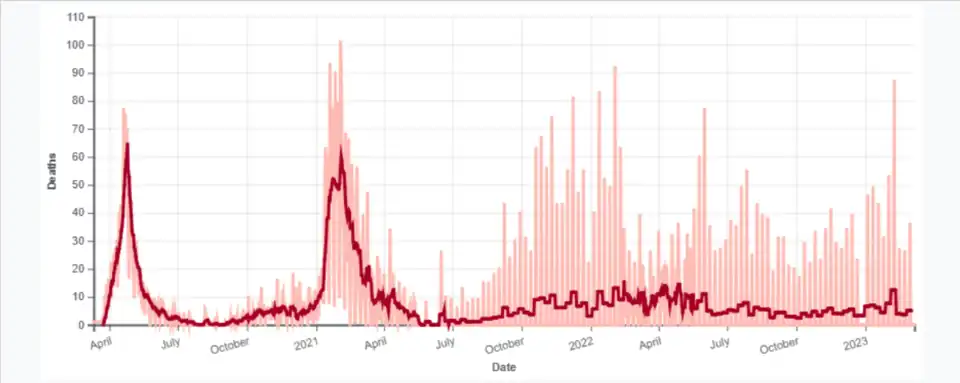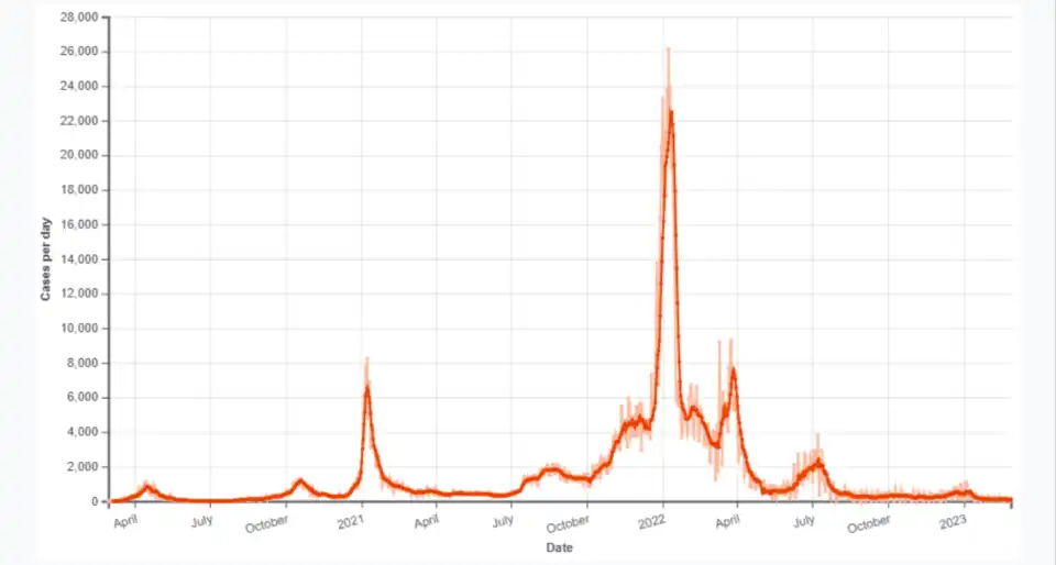 By 13 November 2023, the Department of Health had confirmed 1,725,026 cases and 9,366 deaths;[3] a rate of 342,416 cases per million (34.2% of the population), 1,866 deaths per million (0.19% of the population) and 2,606,161 tests per million population.[53]