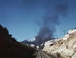 The original grade of the line up the pass rose at a 2.2% slope between San Bernardino and Cajon, where the grade steepened to 3% until reaching the summit 6 miles (9.7 km) further.[18] The route over Cajon Pass was completed with a "last spike" on November 9, 1885,[19] and the first train to use the pass carried a load of rails southward from Barstow on November 12 to be installed near Riverside.[20] The first through train from Chicago via Santa Fe lines arrived in San Diego on November 17, 1885.[21]