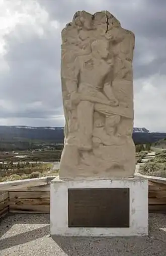 Tie Camps opened near Camp Dubois in 1913. Trees were cut and turned into railroad ties for the growing railroad industry. Dubois timber camps supplied the Chicago and North Western Railway. Those that cut railroad ties were nickname, Tie Hack. Before World War 2 most of the workers immigrant from Ireland, Sweden and Norway. Most Dubois timber camps were operated by the Wyoming Tie and Timber Company.[3][4] At the largest Dubois timber camp is a 14-foot limestone monument overlooks former Tie Camp built in 1946 on U.S. Route 26 (Wyoming Centennial Scenic Byway) at 43°38′47″N 109°55′33″W / 43.646500°N 109.925750°W / 43.646500; -109.925750. The Tie Hack Historical Monument was built by the Wyoming Tie & Timber Company. Tie Hack Historical Monument was carved by Boris Gilbertson. The Tie Hack Historical Monument has a tie hack clutching a broad-head ax and a cross cut saw and other workers cutting and moving ties. A Tie Hack Memorial Marker is also at the site. The Tie Hack Historical Monument is 12 miles (19 km) northwest of Dubois, Wyoming. In 1914 the fist logging site for the Wyoming Tie & Timber Compan was in Togwotee Pass. In 1868 the first Tie Hacking start in Medicine Bow Mountains to supply the Union Pacific Railroad. [5][6]