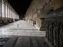The cemetery has three chapels. The oldest ones are the chapel Ammannati (1360) and takes its name from the tomb of Ligo Ammannati, a teacher in the University of Pisa; and the chapel Aulla, were there is an altar made by Giovanni della Robbia in 1518. In the Aulla chapel we can see also the original incense lamp that Galileo Galilei used for calculation of pendular movements. This lamp is the one Galileo saw inside the cathedral, now replaced by a larger more elaborate one.[1] The last chapel was Dal Pozzo, commissioned by archbishop of Pisa Carlo Antonio Dal Pozzo in 1594; it has an altar dedicated to St. Jerome and a little dome. In this chapel in 2009 were translated the relics of the cathedral: the relics include among the others eleven of the twelve Apostles, two fragments of the True Cross, a thorn from the Crown of Thorns of Christ and a small piece of the dress of the Virgin Mary. Also in the Dal Pozzo chapel sometimes a Mass is celebrated.