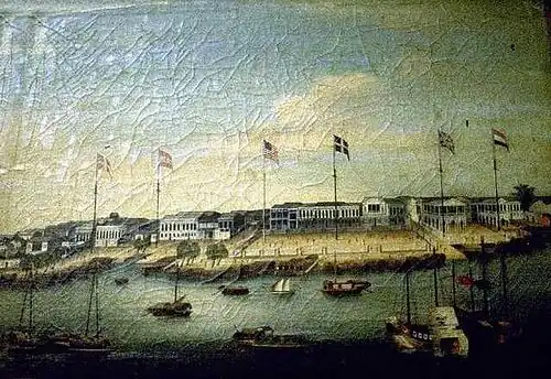 An oil painting from 1780; It shows the bases of merchants from various Western powers – Denmark, Spain, United States, Sweden, United Kingdom, and the Netherlands, established with Canton Factories.