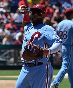 On November 2, 2017, Santana filed for free agency.[36] On December 20, he signed a three-year contract with the Philadelphia Phillies that included a team option for the 2021 season.[37] The value of the three guaranteed seasons was $60 million.[38] Santana reached 1,000 hits for his career on April 7, 2018, with a three-run home run in a 20−1 win[39] versus the Miami Marlins at Citizens Bank Park.[40] For the season, he batted .229 and had the lowest batting average on balls in play (.231) of all major league players, and was second in the major leagues in walks per strikeout (1.18).[41][42] He placed second in the National League in walks (110), hit 24 home runs, 86 RBI, and scored 82 runs.[43]
