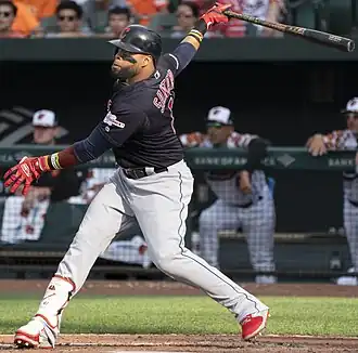 Santana hit the 200th home run of his career on April 28, 2019, versus Wade Miley of the Houston Astros.[47] Selected by fan voting in 2019 to his first career MLB All-Star Game, Santana was named the starting first baseman for the American League. He and Indians were hosts for the event played at Progressive Field[48] and he batted cleanup.[49] Santana also competed in the Home Run Derby.[50] On August 11 versus the Minnesota Twins, he hit a game-winning grand slam in a 7–3 outcome to tie the Indians and Twins for first place.[51] The following night, Santana hit a walk-off home run at Progressive Field to defeat the Boston Red Sox, 6–5, that allowed the Indians to reclaim sole possession of first place in the AL Central for the first time since the previous April.[52] Through August 15, Santana homered five time times in the seventh inning or later to give the Indians a lead.[49]