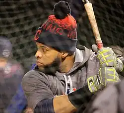 On September 21, 2016, Santana hit his 150th career home run, doing so against the Kansas City Royals.[24] During the regular season, Santana batted .259, 34 home runs, 87 RBI and .865 OPS. He produced 30 home runs and 68 RBI when batting left-handed.[25] Santana homered twice in the 2016 American League Championship Series versus the Toronto Blue Jays. He also recorded the final out of the Series by catching a Troy Tulowitzki pop-up in foul territory, sending the Indians to the World Series. The Chicago Cubs defeated Cleveland in the World Series in seven games.[26] The Indians exercised their $12 million option for 2017.[25]