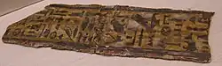 In a technique similar to papier-mâché, scraps of linen or papyrus were stuck together with plaster or resin and used to make mummy cases and masks.[3] It could be molded to the shape of the body, forming a type of shell. After the material dried it could be painted or gilded. The shell could be decorated with geometric shapes, deities, and inscriptions. During the Ptolemaic era, the single shell method was altered to include four to six pieces of cartonnage. There would generally be a mask, pectoral, apron, and foot casing. In certain instances there were two additional pieces used to cover the ribcage and stomach.[4]