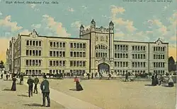 By the turn of the 20th century, the need for a new high school building for Oklahoma City was clear. The construction of the new high school was to be financed by a $300,000 ($7.9 million in 2023) bond issue, which was promoted by Oklahoma High School students, especially the class of 1910. Solomon Andrew Layton, a prolific architect who also designed the Oklahoma State Capitol, designed the building.[2] The new school was built on Robinson Avenue between 7th and 8th Streets, on a site occupying half a city block.[1]