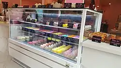 Champagne Poetry has baked goods and pastries such as cakes,[7] cream cheese bread, croissants, macarons,[6] and tarts.[8] Willamette Week has said the business offers "hyperrealistic" cakes, including one that "looks like a perfect Homer Simpson doughnut".[8] Varieties of crêpe cake include rainbow and tiramisu. The Mango Tango mousse cake has chocolate raspberry mousse.[5] The bakery has also used guava to ube as ingredients.[8]