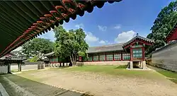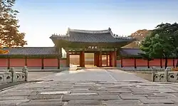 A large gate that leads into the naejŏn. It was named in 1475.[81] Its right and left annexes were destroyed in the Imjin War, and rebuilt in 1647.[22] It was destroyed during the colonial period and reconstructed in 1996.[81]