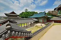 A single-story hall where the king received council and conducted politics.[92] It is a designated Treasure.[82] Spirit tablets were also possibly stored here.[92] It was built in 1405 and originally named Jogyecheong (조계청; 朝啓廳; Chogyech'ŏng). It received its current name in 1461. After being destroyed in 1592 during the Imjin War, it was rebuilt in 1608. It was destroyed in 1623 during the Injo coup and rebuilt in 1647, using materials recycled from a building called Gwangjeongjeon in In'gyŏnggung. It has since become the oldest extant building in the palace.[93] It is the only remaining Joseon palace building with blue roof tiles, which were then considered luxurious and difficult to make.[94][95] During the colonial period, the building was opened to the public, and glass put in its windows. The building was restored to its pre-colonial appearance in 1996.[95]