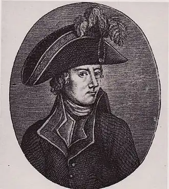 In the time leading to the French Revolution, La Rouërie declared himself a champion of the nobility and parliament of Brittany, which was struggling against the central court at Versailles. He was one of 12 deputies sent to the king in 1787 to petition for restoration of the province's privileges.[1] In 1788 he gave up his military career when he rejected a command offered by Louis XVI, out of opposition to the king's suppression of liberties which the kingdom of France had accorded Brittany on their union, and was imprisoned as a result in the Bastille on 14 July that year.[9] He was freed a month later but would give up his former ideals. At first, he welcomed the Revolution which soon followed, but at the Estates General of 1789 he was indignant at seeing the Breton nobility succumb to the demands of the Third Estate. Excited to resistance, he provoked a refusal to send representatives to the Estates General, saying that he did not want those of the ancient nobility to bend over themselves to become a double representation of the people. This helped lead to the creation of the Breton Association.[7]