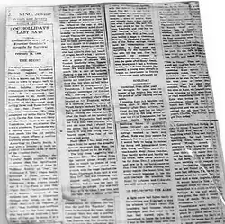 In 2000, a man called Clifton V. Brewer claimed to have found a collection of documents belonging to Smith in a trunk from his great-great-grandfather, supposedly a friend of Smith's. The find was "dubious" but still widely publicised until an intricate investigation proved it to be false. Some letters were the main documents, and the proof of fakery then cast doubt on related documents, like a newspaper article said to be from Sulphur Headlight which detailed Smith's eyewitness accounts of the last days of Doc Holliday in Glenwood Springs.[1] The letters appeared to say that Smith was compiling memoirs in Tombstone in 1887, which were passed to a friend for help, who then had the Holliday pages published in Sulphur, Oklahoma, on February 14, 1899. The only records were in the possession of this supposed friend and then his descendants. The letters gave a "standard account" of Holliday's illness and death, with more imaginative details of surrounding circumstances and other peoples' emotions.[14]