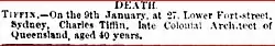 From 1868 to 1871 Charles Tiffin was also the Superintendent of Roads and Bridges. However, in 1871, he criticised the government's policy on roads. His career ended at that time. He took a year of leave and then retired on medical grounds in April 1872. He died on 9 January 1873 at 27 Lower Fort Street, Sydney, New South Wales at the age of 40.[1][2][20][21]