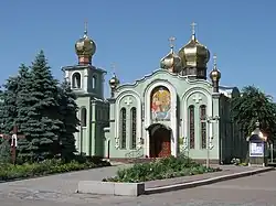 • Castle Hill (Hill of Glory). The memorial complex with a monument "Motherland" is located at the top of the former Castle Hill. At this point, ancient Cossack fort, remains of Cherkasy fortress and Holy Trinity Church were situated. In 1977 all architectural and archaeological sites were completely destroyed during construction of the monument, although the new Holy Trinity Cathedral was constructed nearby.[26] From the top of the hill a panoramic view opens on the Kremenchuk Reservoir.