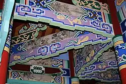 A bridge connects the pavilion island and the inner garden, alluding to the island of immortals. The circular pavilion embodies the middle, and so the fifth cardinal direction in the culture of China. Its inscriptions refer to water as a symbol of friendship between the cities of Kunming and Zurich. The hexagonal pavilion suggests lofty heights and snow drift in winter. The carvings are full of allegories: the fenghuang (Chinese phoenix) as a symbol of the empress, and flowers as another symbol of female beauty. The inside of the pavilion displays symbols of good luck and landscapes. A square pavilion forms the entrance to the galleries and to the water palace. Its entrance shows two golden phoenixes. A carved archway is devoted to the spring, a magpie and plum blossoms announce the newly waked life. Open galleries are adorned by more than 500 still lifes and landscapes. Its carved archmbeams are a particular feature of the gardens of Yunnan. A short winding path symbolizes abundance and harmony.