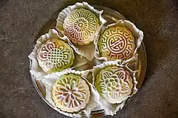 Gao or guo (; ; gāo or 粿; guǒ) are rice-based snacks that are typically steamed[1] and may be made from glutinous or normal rice. In Fukien speaking Chinese populations, these are known as Kuei, which are based on the Fukien pronunciation of "粿". These rice-based snacks have a wide variety of textures and can be chewy, jelly-like, fluffy or rather firm and unlike bings very different from western pastries. Various types of gao include Nian gao, Bai Tang Gao, Tangyuan and Ang Ku Kueh.