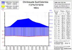 Chiribiquete National Natural Park has a tropical climate and gets about 4,500 mm of precipitation per year. The park has high levels of cloud cover due to the geographic orientation of the Serranía de Chiribiquete mountains. Rainfall is lowest between December and February, and highest between April and July. The annual average temperature is 24 °C (75 °F) with strong fluctuations between day and night. During the dry months, temperatures can rise to 32 °C (90 °F) during the day, and fall to 20 °C (68 °F) at night. The temperature difference between the lower and higher altitudes of the park is also very high. Temperatures can reach 35 °C (95 °F) in the lower altitudes and drop to 2 °C (36 °F) in the higher altitudes. The average humidity is 40% at daytime and rises to 100% at nighttime.[11][14][15]