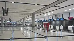 The main terminal building contains a combined check-in hall for domestic and international flights. It has 58 check-in counters, in addition to self-service check-in kiosks. A common baggage claim hall is also located on the ground floor.[42] There is a large retail area on the first floor, with many food and retail outlets as well as waiting areas. A major feature of the terminal is a $15 million state-of-the-art baggage handling system, which is 750 metres (2,460 ft) long.[43]