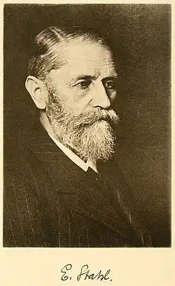 Stahl was born in Schiltigheim to timber merchant Christian Adolf and Magdalene née Rhein. He went to the local schools and then grammar school at Strasbourg. He studied botany at the University of Strasbourg with Pierre-Marie-Alexis Millardet (1838-1902). The Franco-Prussian War of 1870-71 made him move to the University of Halle where he studied under Anton de Bary (1831-1888). He earned his doctorate in 1874 with a thesis on lenticels. He later became an assistant to Julius von Sachs (1832-1897) at the University of Würzburg. He was appointed an associate professor at the University of Strasbourg in 1880, and after just one year, he attained the chair of botany at the University of Jena in 1881, succeeding Eduard Strasburger. Here, he also served as director of the botanical garden.[1][2][3]