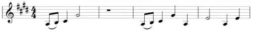 This is repeated until (0:36) when a second guitar begins to double the melody, with slight variations. At (1:12), one of the guitars begins to play a counter-melody, and at (1:28), the bass guitar also begins a counter-melody. At (1:47), both guitars begin playing the first counter-melody. At (2:04), one of the guitars begins playing another counter-melody, until (2:57), when the guitars begin doubling themselves again. At (3:14), the bass guitar ceases playing and the guitar strumming becomes more predominant, until (3:47), when the bass guitar suddenly begins playing a loud, slightly distorted counter-melody. The instruments build up in a gradual crescendo, increasing in volume and tempo, until (4:39), when the drums enter and the guitars strum a chord structure based around the chords of C♯ minor, C♯ suspended 2nd, and A major. At (5:14), the guitars suddenly turn distorted, repeating the chord structure until (5:43), where one of the guitars plays a solo. At (6:10), the guitars strum a C♯ minor chord until (6:18), where the guitars turn clean and the chord structure is reintroduced. At (6:29), a violin solo begins playing quietly in the background; the reason for the quietness being the song using the same solo as recorded by Luke Sutherland for "Xmas Steps", which was played significantly faster.[1] At (6:34), the guitars begin the last counter-melody of the song, doubling each other with noticeable variations. The drums cease playing at (7:10), leaving the guitars playing their melodies, and gradually slowing down in a diminuendo with the violin solo playing faintly in the background, until (10:28), when the guitars cease playing, ending on a C♯, which fades out.