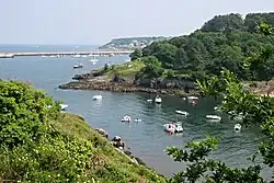 Churston Cove is a cove with a sand and shingle beach on the outskirts of Brixham, surrounded by cliffs and wooded hillsides. An entrance to Churston Woods is located at the back of the cove. There is a steep path leading down to the beach which also passes through Churston Woods. It is on the South West Coast Path.[1]