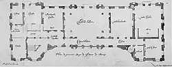 Plan of the central pavillion and a portion of each adjoining wing at the level of the ground floor except for the east wall, which depicts the columns at the level of the main-floor peristyle (project) [18]