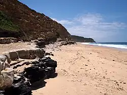 A group of escaped convicts led by a married couple William and Mary Bryant were the first Europeans to find and use Australian coal, at the end of March 1791. They found "fine burning coal" near a "little creek" with cabbage tree palms 'about 2 degrees' north of Sydney, "after two days sailing". This first hand account of the discovery—written by one of the party James Martin—was found in a collection of manuscripts and published in 1937.[2] The escapees never returned to Sydney and their discovery of the coal remained unknown, until after they were recaptured at Kupang. William Bryant also wrote an account that is now lost but William Bligh—later a governor of New South Wales—saw it, when he visited Kupang in 1792. Bligh made a summary of Bryant's account in his log and quoted him as saying, "Walking along shore towards the entrance of the Creek we found several large pieces of Coal—seeing so many pieces we thought it was not unlikely to find a Mine, and searching about a little, we found a place where we picked up with an Ax as good Coals as any in England—took some to the fire and they burned exceedingly well".[3] It is likely that the location was near the entrance to Glenrock Lagoon, where coal is exposed, low in the sea cliff, and which was later the site of the Burwood Colliery.[4]