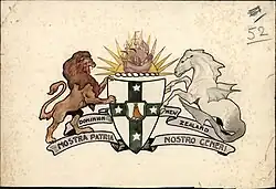 With the evolution of New Zealand self-government, especially the granting of dominion status in 1907, it was decided that a new coat of arms was required. An official competition held in 1908 received 78 designs.[4] The winning entry was a design by James McDonald, a draughtsman in the Department of Tourist and Health Resorts. Some minor adjustments were made to the design and the arms were granted by royal warrant of King George V on 26 August 1911. The warrant was published in the New Zealand Gazette of 11 January 1912.[1][5]