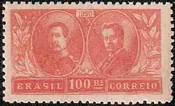 South America is the world's largest coffee-producing region,[39] with Brazil being the world's largest producer.[44] Brazil has issued numerous coffee stamps.[13] Commemorative stamp issued in 1920 for the visit of King and Queen Albert of Belgium to Brazil, showing King Albert and President Pessoa's portraits side by side, with a branch of a coffee tree bearing fruit to the right of President Pessoa.[7]