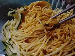 Cold noodles are dishes typically made out of noodles, soy sauce, cucumber, and various other ingredients. They are commonly served at room temperature with a dipping sauce on the side.[1] The methods and ingredients used to make cold noodles vary from country to country.