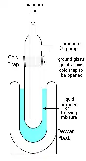 Cold trap immersed in cold medium in Dewar flask. Some workers prefer the opposite arrangement, where vapors flow down the wall of the trap, and are sucked up the inner tube; this reduces blockage.[1]