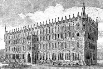 Almost all the windows are enclosed by the parabolic arches, and on the ground floor the arches form a gallery. On the first and second floors, the arches are inscribed in a rectangle of bricks. On the top floor, a succession of arches (alternating open and blind) form a large frieze that crowns the whole, which is superimposed on the roof railing which is combined with a kind of merlet. It is triangular in shape and pinnacles with four-armed crosses at the corners.[1]