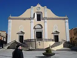 The collegiate church, characterized by the external stone staircase that divides into four branches, with its 2,000 m2 (22,000 sq ft) of surface area, 58.5 m (192 ft) in length, 32.4 m (106 ft) in width and 25 m (82 ft) in height, is the largest church in the diocese of Cerreto Sannita-Telese-Sant'Agata de' Goti.[1] Inside it are preserved numerous 18th-century paintings, valuable wooden statues, some ancient Cerretese ceramic floors, a 19th-century organ in a Baroque case, and some altars made of inlaid polychrome marble.