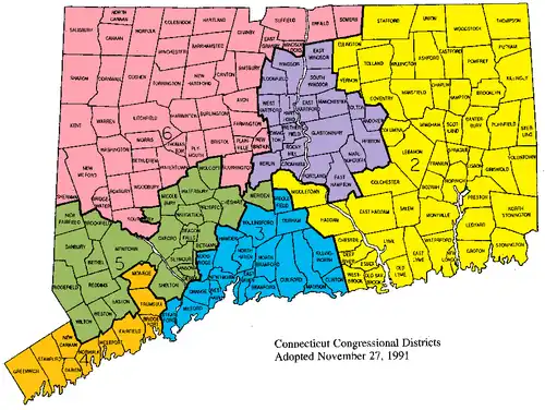 Connecticut's congressional districts, 1993–2003 (prior to elimination of 6th district). The sixth district is in the northwest corner, highlighted in pink.
