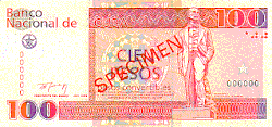 $100 150 x 70 mm Red, orange, and bright yellow Monument to Carlos Manuel de Céspedes. ALTERNATIVA BOLIVARIANA PARA LAS AMERICAS (ALBA): Satellite dish, Latin America map, woman and man reading, oil refinery. 2006, 2007 January 1, 2021 Visible against the light José Martí's effigy and number "100".
