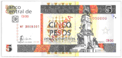 Once again, the face values of 5 and 10 convertible pesos were issued in the year 2005. The main motifs on the front and back and the predominant colors are the same as the previous issues. For the printing of the main elements on the front, the Intaglio system was used, which gives them higher quality, security, and aesthetics, as well as a tactile relief.