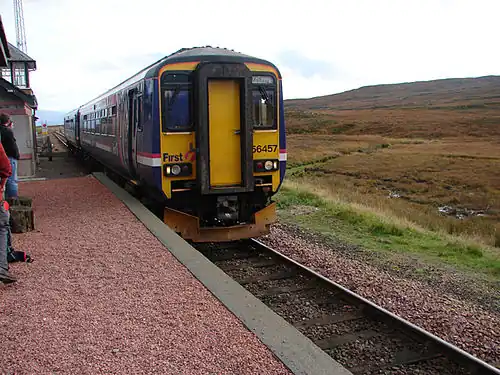 Corrour railway station (/kəˈrər/ kər-OUR) is on the West Highland Line, near Loch Ossian on the Corrour Estate, in the Highland council area (formerly Inverness-shire) of Scotland. It is the highest mainline railway station in the United Kingdom at an elevation of 1,340 feet (410 m) above sea level.[4][5] It is located between Rannoch and Tulloch, and is sited 71 miles 54 chains (115.3 km) from Craigendoran Junction, near Helensburgh.[6] ScotRail manage the station and provide most services, along with Caledonian Sleeper.