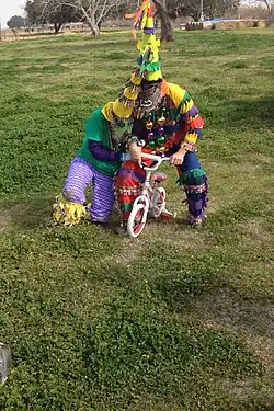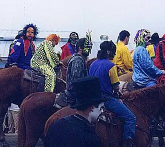 The Courir de Mardi Gras (Cajun French pronunciation: [kuɾiɾ d maɾdi ɡɾa], French pronunciation: [kuʁiʁ maʁdi ɡʁa]) is a traditional Mardi Gras event held in many Cajun and Creole communities of French Louisiana on the Tuesday before Ash Wednesday. Courir de Mardi Gras is Louisiana French for "Fat Tuesday Run". This rural Mardi Gras celebration is based on early begging rituals, similar to those still celebrated by mummers, wassailers, and celebrants of Halloween.[1] As Mardi Gras is the celebration of the final day before Lent, celebrants drink and eat heavily, dressing in specialized costumes, ostensibly to protect their identities. In Acadiana, popular practices include wearing masks and costumes, overturning social conventions, dancing, drinking alcohol, begging, trail riding, feasting, and whipping. Mardi Gras is one of the few occasions when people are allowed to publicly wear masks in Louisiana.[2] Dance for a Chicken: The Cajun Mardi Gras, a documentary by filmmaker Pat Mire, provides insight into the history and evolution of this cultural tradition. In popular culture, two HBO series (the crime drama True Detective and the post Hurricane Katrina themed Treme) also make reference to the tradition.[3]