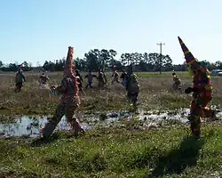 The whips are designed to be flexible and not to inflict any serious damage onto their victims, but do produce a loud noise for the edification of onlookers. Participants claim one has not fully participated until one has been whipped.[29] Once they are on the property, the revelers play a variety of pranks on the farmers and beg for food[26] for the communal gumbo that lies at the end of the route. A prize ingredient is a live chicken, which is usually thrown into the air for the drunken Mardi Gras to chase through the muddy yards and fields.[28]