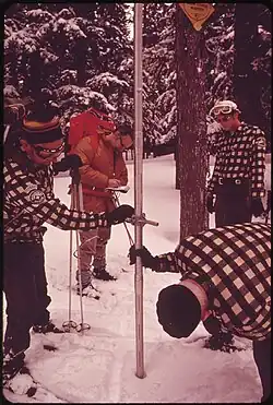 ![]() Crag Rats wearing traditional black-and-white check flannels measure snow levels, 1973 | |