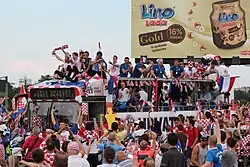 The Croatian Football Federation endorses an official fan club for the team, known as Uvijek Vjerni ("Always Faithful").[211] A part of the team's support consists of fans of Dinamo Zagreb and Hajduk Split, the two largest clubs in Croatia's top domestic football league, the Hrvatska nogometna liga (HNL).[212] Both sets of fans—Bad Blue Boys from Zagreb and Torcida from Split—have been associated with hooliganism due to their ultra-style support.[213][214] Regional support for the team also comes from Croats of Bosnia and Herzegovina, particularly from fans of domestic clubs Zrinjski Mostar and Široki Brijeg.[215] The diaspora of Croatians across the United States, Canada, Australia, and South America contribute to the majority of the side's international support.[216][217] It is customary among supporters to include an inscription of their city of origin onto the Croatian flag. Fans also coordinate their vocal support and orchestrate chants during matches. One section may shout "U boj, u boj" ("To battle, to battle") with another responding "Za narod svoj" ("For our people").[218] In addition to chants, the team regularly have songs dedicated to them, such as Slaven Bilić's "Vatreno ludilo" (Fiery Madness) which topped Croatian music charts during Euro 2008.[219][220]