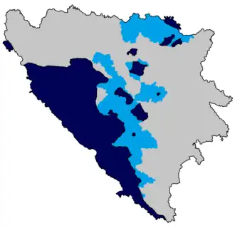 At the beginning of the war, JNA and VRS forces gained control of Serb-majority areas that were proclaimed part of Herzeg-Bosnia. By late 1992 Herzeg-Bosnia lost Kupres, most of Bosnian Posavina, and Jajce to VRS.[71] The territory under the authority of Herzeg-Bosnia became limited to Croat ethnic areas in around 16% of Bosnia and Herzegovina.[72] The arrival of Bosniak refugees from areas captured by the VRS to HVO-controlled parts of central Bosnia and Mostar altered the ethnic structure and reduced the share of Croats.[73][74]
