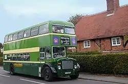 ![]() A preserved 1960s Aldershot and District Traction Company bus (a Dennis Loline III) passes an old cottage in Crookham Village | |