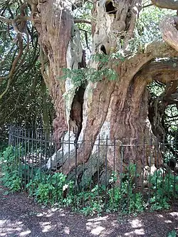 Like the village of the same name in Surrey, this East Sussex Crowhurst also has an ancient yew tree (Taxus baccata) in the grounds of its church which is also dedicated to St George. This has caused much confusion. The Sussex yew is cordoned off by iron railings and reinforced with steel wires to prevent collapse. The tree's age is uncertain but estimates range from 1,300 to 4000 years.[15]