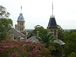 By 1820 a large part of the area had been subsumed by Joseph Underwood's large 'Ashfield Park Estate'. This property remained largely intact for more than 40 years, until it was subdivided into large blocks after the death of Elizabeth Underwood in 1858. By this time its proximity to the railway made it a desirable area (the station was originally called Fivedock).[9] One of these subdivisions was the 'Highbury Estate', on part of which Anthony Hordern, son of the founder of the great retail firm, Anthony Hordern & Sons, eventually built his house 'Shubra Hall', just beyond the west border of Ashfield. It later became part of the Presbyterian Ladies' College, the current boundaries of which give an idea of the extent of the Hordern property.[8] The College, including Shubra Hall, the main school building and the Meta Street entrance gates, is now listed on the Register of the National Estate.[10]