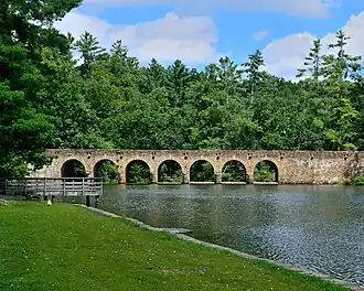Part of the Cumberland Homesteads Project called for the construction of a recreational area near the center of the homesteads. Two New Deal agencies, the Works Progress Administration and the Civilian Conservation Corps, arrived in the area in 1934 to build the recreational area's facilities.[2] Company 3464 of the CCC, under the direction of the National Park Service, began the construction of Byrd Creek Dam in 1935 and completed it in 1938, effectively creating the 50-acre (0.20 km2) Byrd Lake. The dam, like many of the Homestead structures, is constructed of a native sandstone commonly called Crab Orchard Stone. At a height of 28 feet (8.5 m) and length of 319 feet (97 m), the dam is the largest masonry project ever completed by the CCC. CCC Company 3464, assisted by Company 1471, continued to work at the park until 1941, building trails, picnic areas, cabins, a boathouse, a bathhouse, and other structures.[3][4]