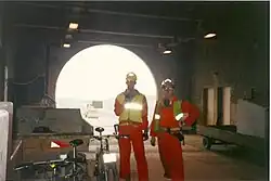 In November 1993, journalists Nick Dutton-Taylor and Damon Brown used the same Saracen bicycles as other construction workers to cycle into the tunnel for an article in Mountain Biking UK.[2][5][6][7][8] They were trained and accompanied by the cycling trainer Clive, but not allowed to go the full way through.[2]