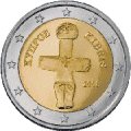 - €1 and €2: The Idol of Pomos, a cross-shaped idol dating back to the Cypriot chalcolithic period (3000 B.C.), found in Pomos, a village in the district of Paphos. It is a characteristic example of prehistoric art in Cyprus, representing the island's antiquity, culture and civilization.